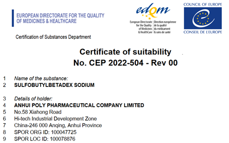 安徽普利药用辅料磺丁基倍他环糊精钠喜获CEP证书