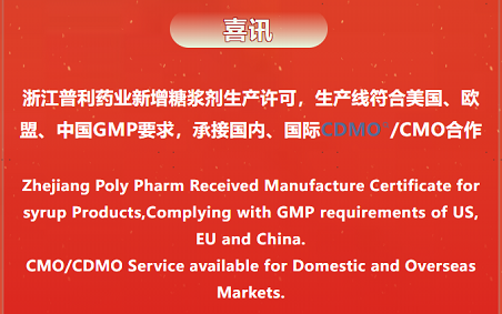 浙江普利药业新增糖浆剂生产许可,生产线符合美国、欧盟、中国GMP要求,承接国内、国际CDMO/CMO合作