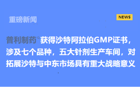 普利制药获得沙特阿拉伯GMP证书,涉及七个品种,五大针剂生产车间,对拓展沙特与中东市场具有重大战略意义