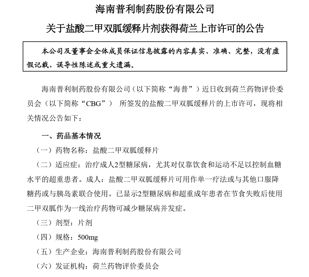 神药出口普利制药二甲双胍缓释片获得荷兰上市许可!