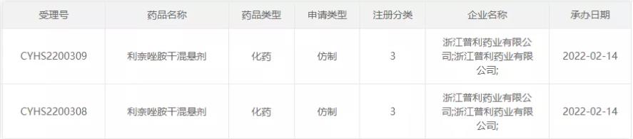 22月14日,浙江普利药业按仿制3类申报的利奈唑胺干混悬剂上市申请获得CDE承办受理,目前国内尚无企业获批生产该品种,浙江普利为首家申报上市的企业。